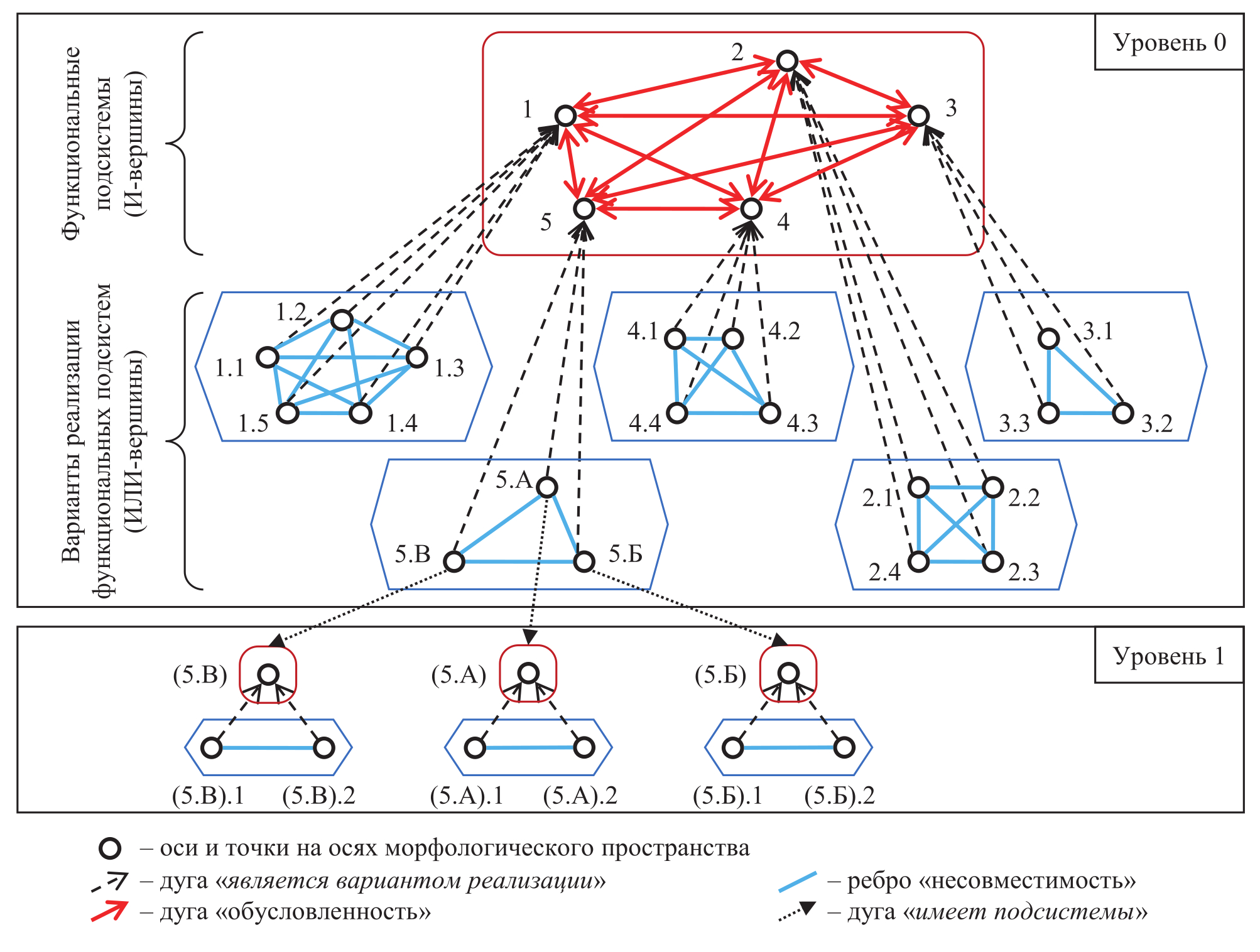 При необходимости введения в морфологическую модель ограниченной сочетаемости ВР различных ФСП проектируемого артефакта стараются обойтись «запретами на сочетания», т.е. ограничиться расширением (2) базовой модели морфологического пространства. Это объясняется тем, что в этом случае морфологический синтез ТР получает хорошую теоретическую поддержку, связанную с моделированием и анализом многодольных графов, а также методами и алгоритмами решения задачи о независимом множестве вершин графа [22]. Аргументация такого подхода, как правило, ограничивается экспертным мнением, что «запреты на сочетания» чаще всего встречаются в проектной практике инженеров различного профиля [9], что во многих случаях с помощью одних только запретов можно обосновывать различные закономерности в природе и технике [23, 24].