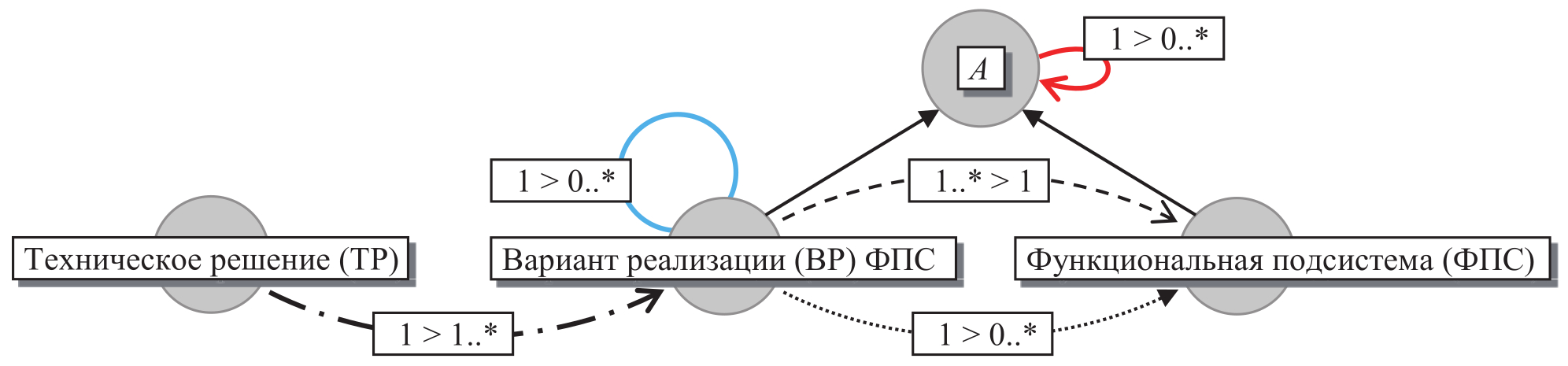 Рисунок 7 – Диаграмма «сущность-связь» онтологии предметной области морфологического анализа технических решений: А – понятие о предметах, существование которых может и обусловливать существование, и обусловливаться существованием других таких же предметов; – дуга отношения «ТР включает ВР ФСП»; – дуга отношения «обобщает» между сущностями; легенды других отношений см. на рисунке 2