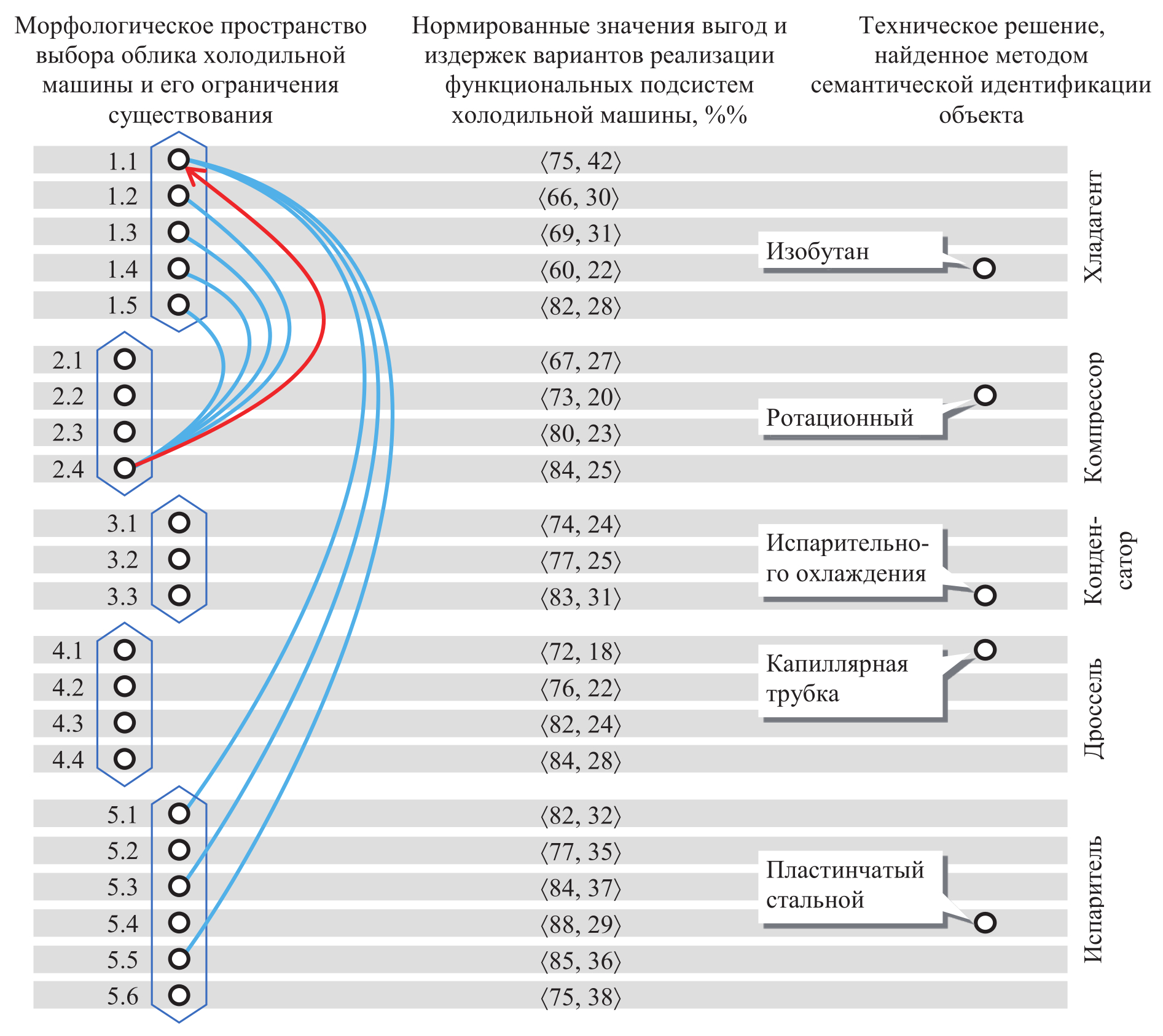 Рисунок 8 иллюстрирует решение задачи синтеза ТР на примере холодильной машины. Слева представлены ВР ФСП и ограничения существования: «линейная» форма морфологи-ческой таблицы 1 устанавливает несовместимость ВР каждой ФСП, а дуга и ребра описывают ограниченную сочетаемость ВР разных ФСП. В средней части рисунка 8 приведены нормированные значения выгод и издержек, связанных с включением в ТР отдельных ВР ФСП (в процентах), справа демонстрируются ВР ФСП - компоненты ТР, найденного методом семантической идентификации объекта при запрете считать пустое множество нормальным.