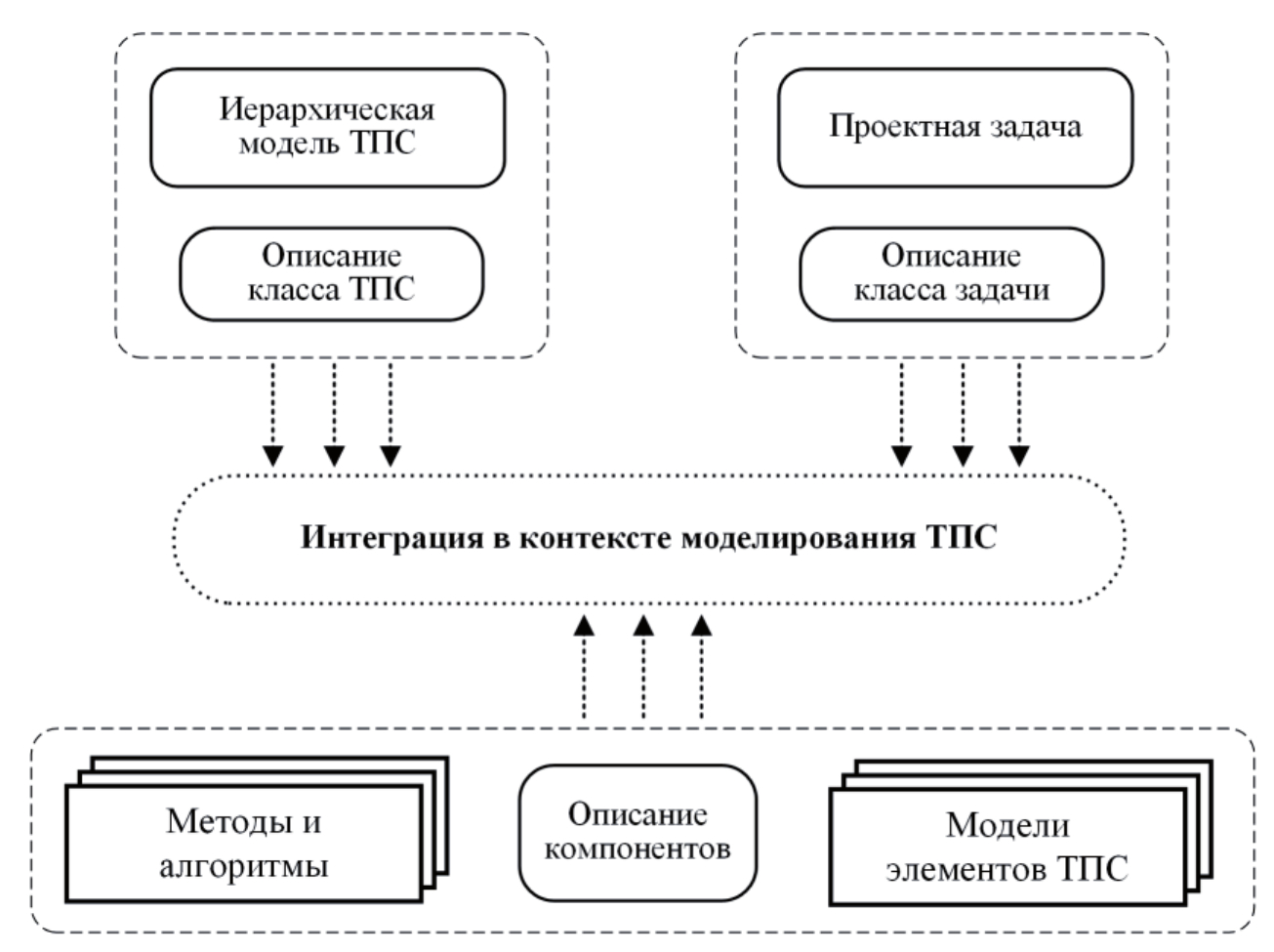 Проектирование осуществляется на основе интеграции представленных на рисунке 1 составляющих в рамках единого процесса моделирования ТПС. Вследствие различия ТПС и их подсистем возникает необходимость автоматизации организации вычислительного процесса для достижения необходимой гибкости в адаптации на особенности конкретной ТПС.