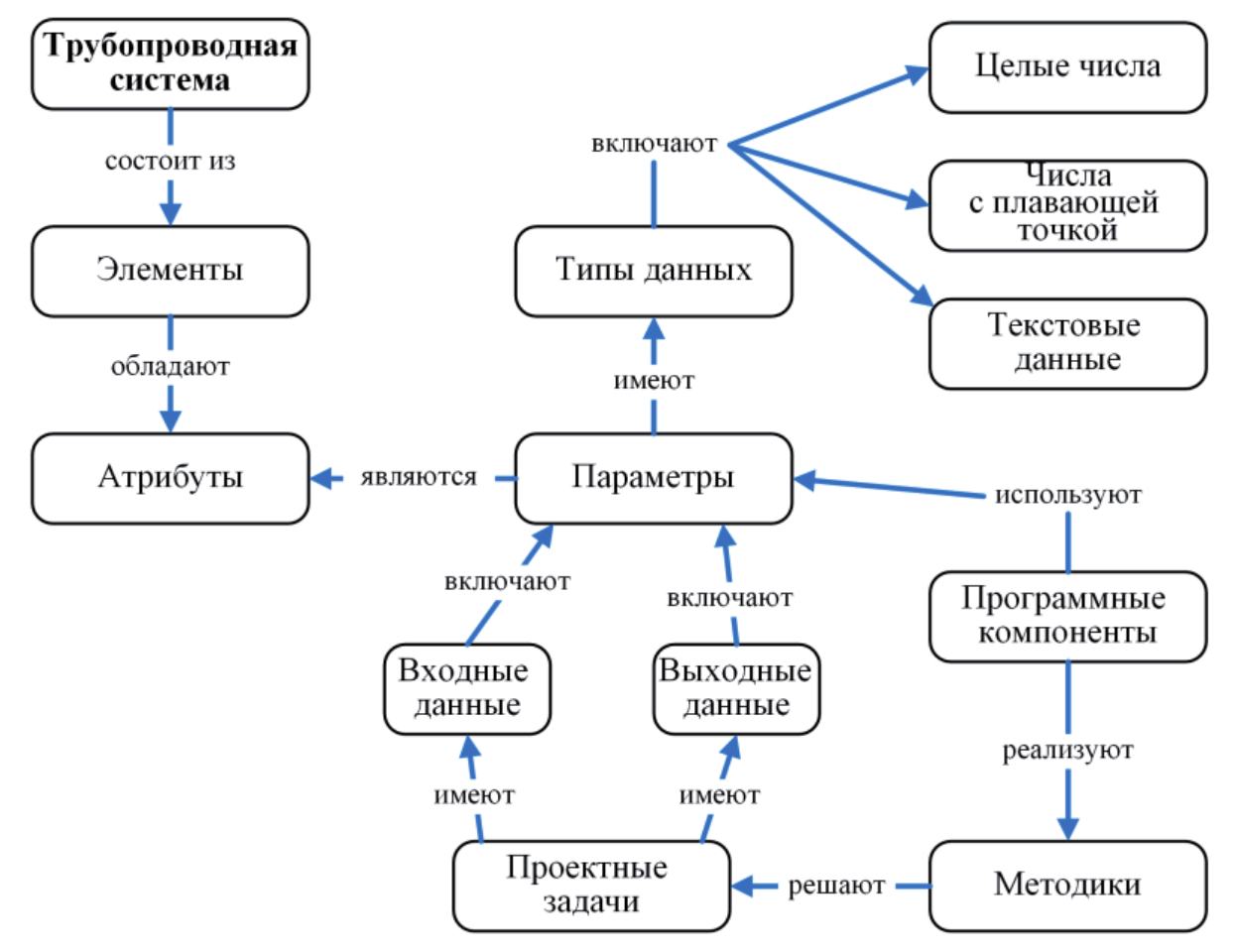 В соответствии с предложенной методикой вводятся базовые понятия ПрО (см. рисунок 3). Концепт «Трубопроводная система» состоит из «Элементов», обладающих «Атрибутами», которые в ТГЦ называются «Параметрами». Для автоматизации работы с параметрами вводится описание их «Типов данных», включающих «Целые числа», «Числа с плавающей точкой», «Текстовые данные» и др. Решаемая «Проектная задача» имеет «Входные данные» и «Выходные данные», включающие «Параметры» элементов моделируемой системы. Для решения «Проектной задачи» используется «Методика», реализованная в «Программном компоненте».