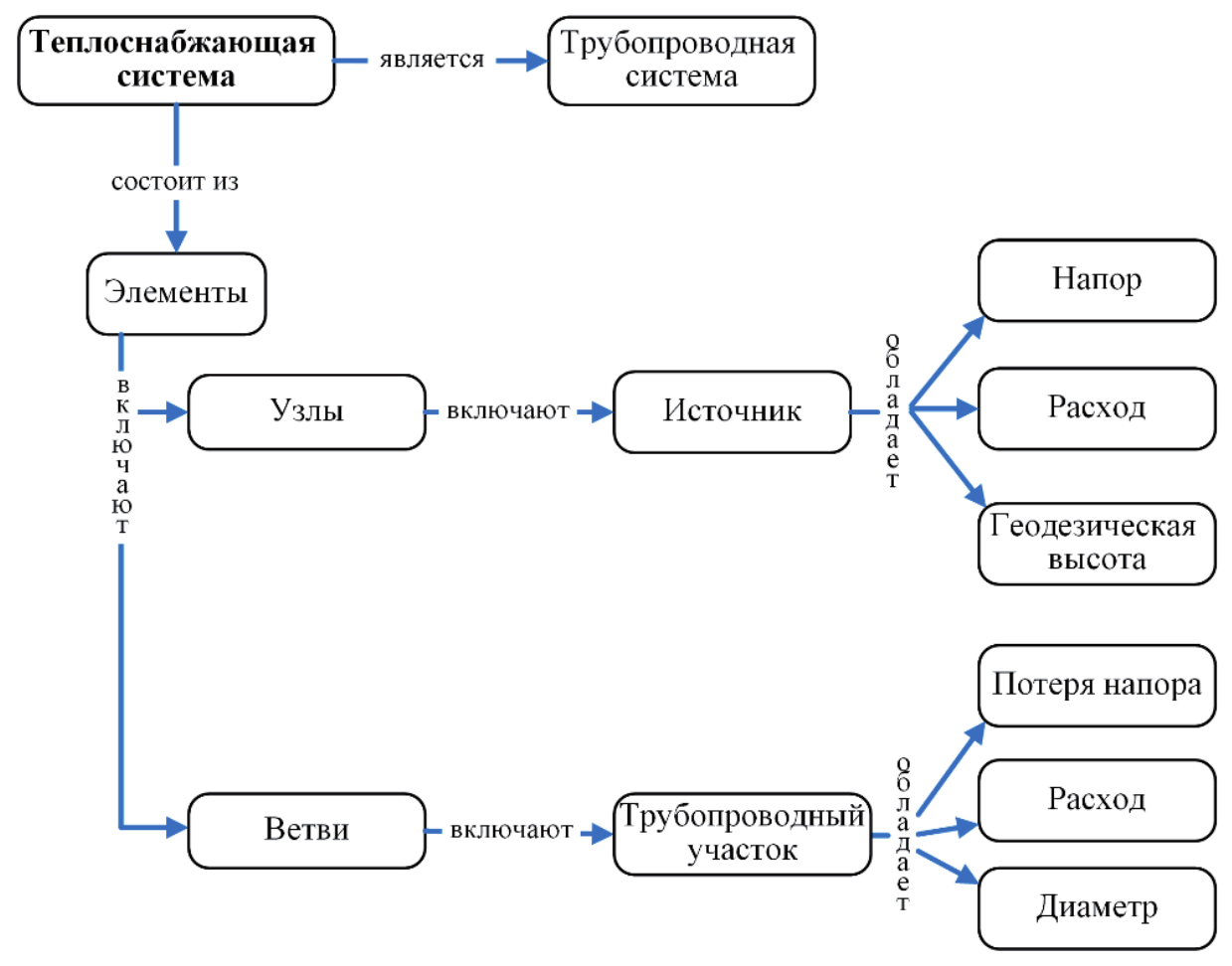 Методику построения онтологий ТПС конкретного типа можно показать на примере онтологии ТСС (см. рисунок 5). Эта онтология предназначена для описания построения иерархической модели ТСС и позволяет получить информацию о том, какие типы элементов образуют «Теплоснабжающую систему», какими «Параметрами» обладают «Элементы» и какие «Типы данных» соответствуют «Параметрам». Например, таким элементом является «Источник», обладающий «Напором», «Расходом» и «Геодезической высотой»; «Трубопроводный участок» является «Ветвью» и обладает такими параметрами, как «Потеря напора», «Расход» и «Диаметр».