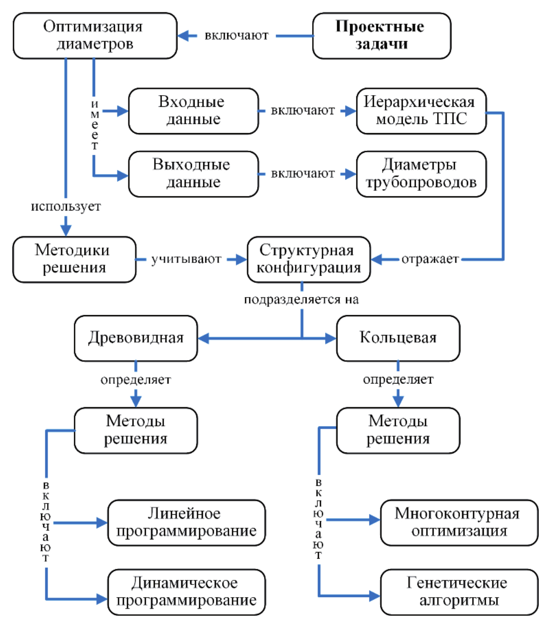 На рисунке 6 приведён фрагмент онтологии задач, который содержит описание задачи оптимизации диаметров трубопроводов ТПС. Вводится концепт задачи «Оптимизация диаметров». «Входными данными» для её решения является «Модель ТПС», а «Выходными данными» – «Диаметры трубопроводов». «Модель ТПС» отражает «Структурную конфигурацию», которая определяет «Метод решения» задачи.