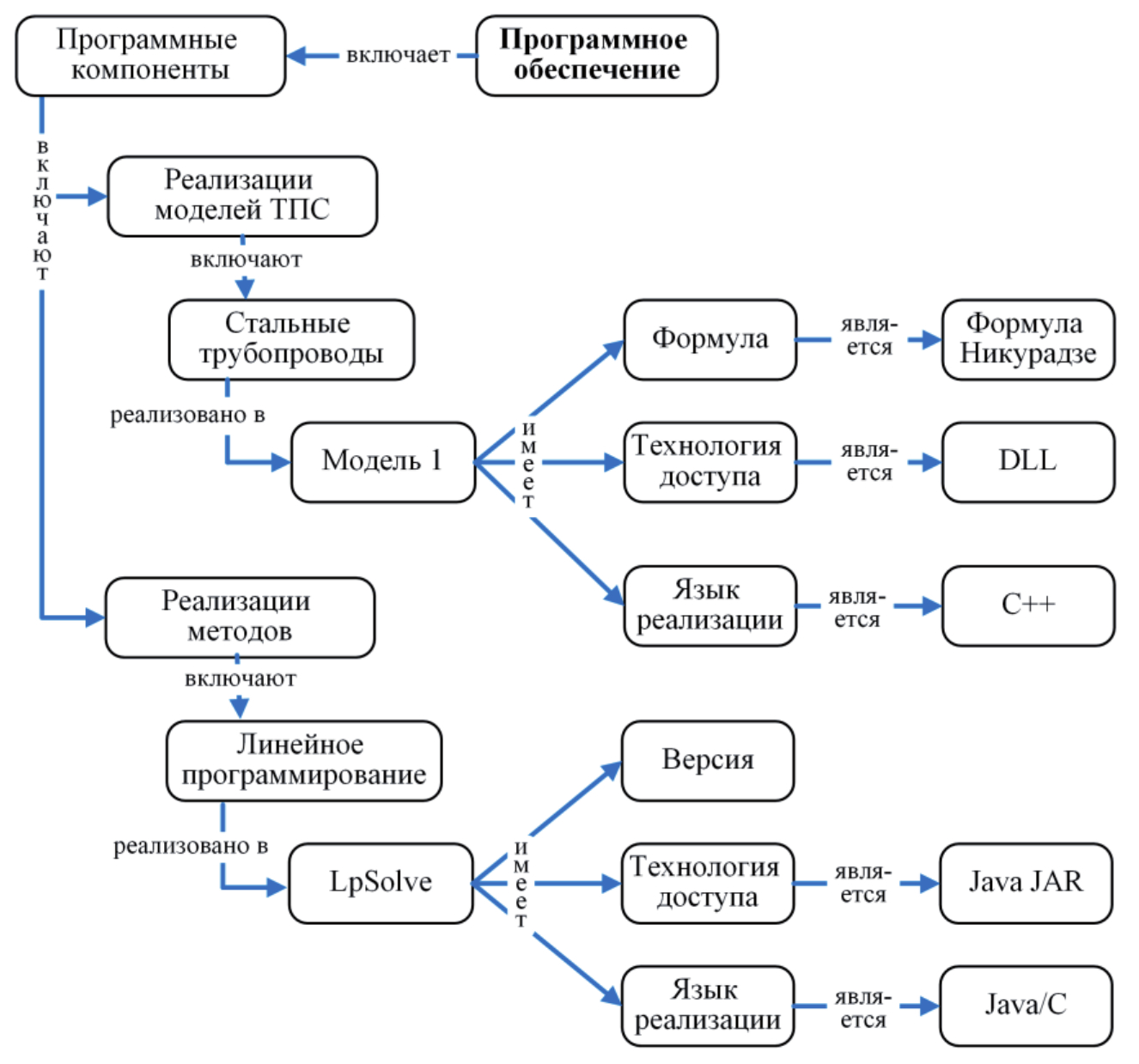 На рисунке 7 представлен фрагмент онтологии ПО, содержащий описание программных компонентов. «Программные компоненты» включают «Реализации моделей ТПС» и «Реализации методов». «Реализации моделей ТПС» включают реализацию моделей «Стальных трубопроводов». Модель «Стального трубопровода» обладает «Формулой», «Технологией доступа» и «Языком реализации». «Реализации методов» включают реализацию «Линейного программирования» в виде компонента «LpSolve». Этот компонент обладает «Версией», «Технологией доступа» и «Языком реализации».