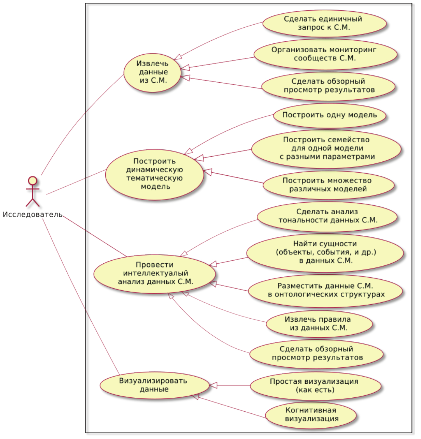 За основу технологии принята созданная система мониторинга (С.М.) сообществ социальных медиа [29]. Получаемые с помощью этой системы данные регулярно обрабатываются с целью выявления динамических аспектов объектов и процессов, с которыми эти данные связаны. На рисунке 1 представлены в виде диаграммы использования UML (Unified Modeling Language) возможные варианты исследования динамических свойств результатов ТМ на основе открытых больших данных социальных медиа.