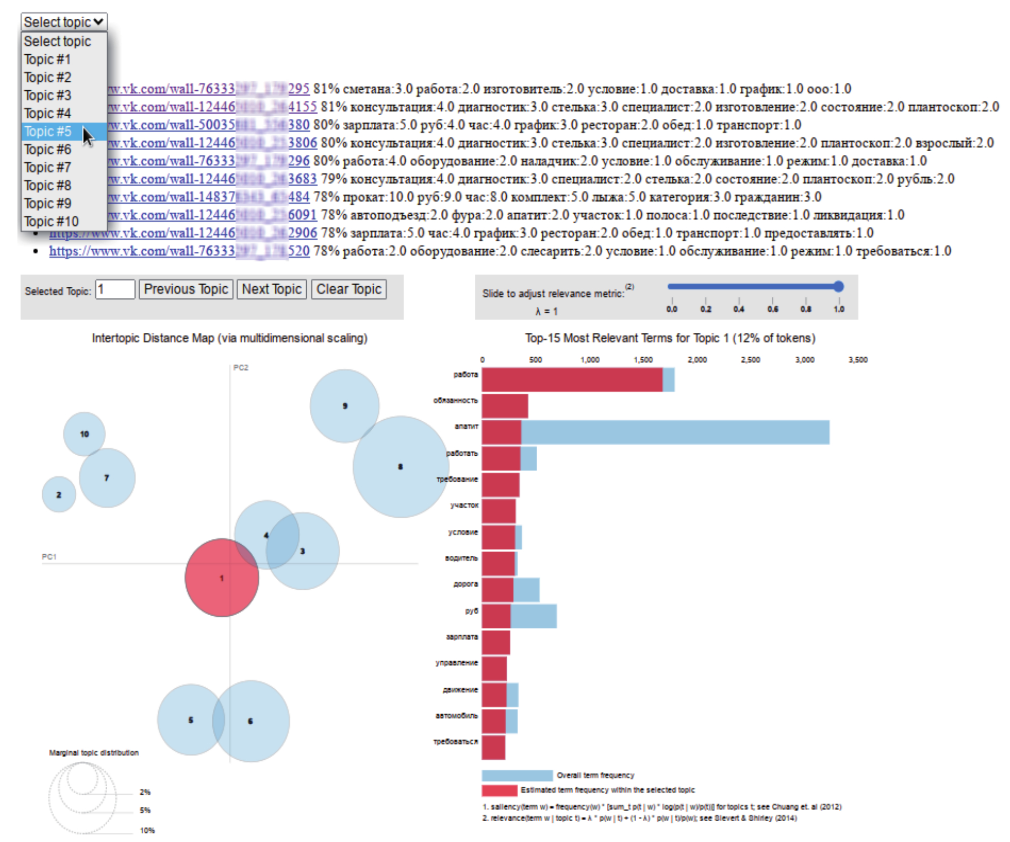 Технологии ТМ постоянно развиваются. Существуют средства когнитивной визуализации результатов ТМ (например, LDAvis [30]). Однако данное средство позволяет видеть лишь часть результатов ТМ, которая представляет собой визуализацию содержимого матрицы Φ, т.е. тематическую разбивку словаря анализируемого корпуса текстов. На координатной плоскости, задаваемой номинальными координатами [31], отображается взаимное расположение выявленных тем. В данной работе развитие функции pyLDAvis расширено возможностью работы с содержимым матрицы Θ, т.е. распределением документов корпуса текстов по темам. На основе результатов ТМ пользователю предоставлена возможность выбора темы для анализа и интерпретации результатов моделирования. Производится автоматическая выборка и отображение строк матрицы Θ, связанных с исходными текстами, обладающими максимальной вероятностью принадлежности к выбранной теме. Посредством автоматического размещения гиперссылок рядом со строками матрицы Θ обеспечивается доступ к исходным текстам (см. рисунок 6).