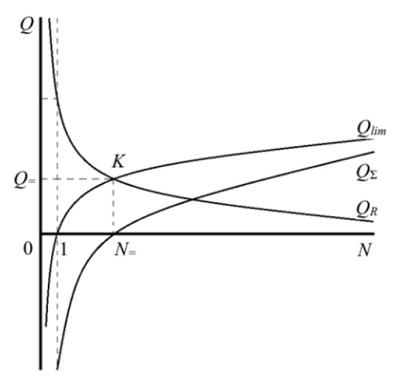 Пусть взаимное влияние NРС и NСБ друг на друга при совместном их функционировании ограничивается только уменьшением предельного значения Qlim на величину QR: QΣ=Qlim–QR. Формализация оценки Qlim и QR произведена в [16, 18]. Результирующее значение QΣ показано на рисунке 1 вместе с Qlim и QR.