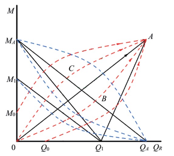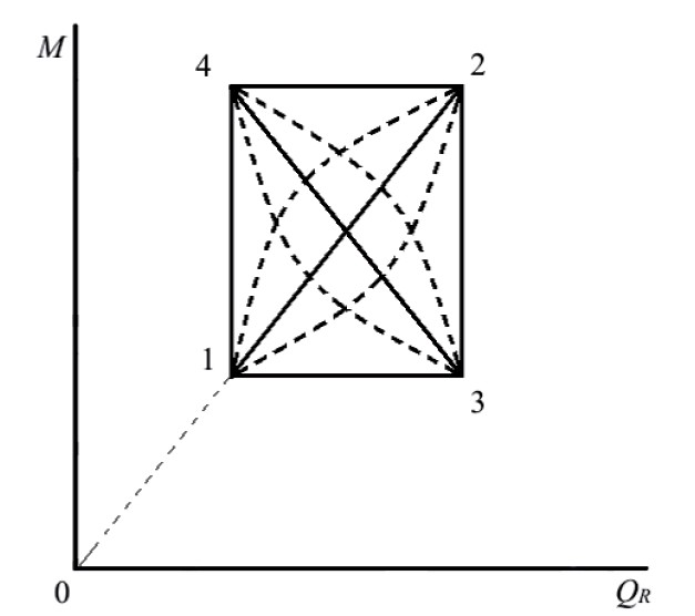 Циклическая работа ТС возможна с проявлением обратимости или необратимости переходов состояний ТС. Случаи обратимости рассматриваются по аналогии с циклом Карно [21]. Эти переходы характерны для ТС, осуществляющих функциональность только на внутренних запасах без отбора ресурсов. При сохранности ЭСС состояние ТС не ухудшается. Если в ходе работы эксплуатационные возможности устойчивости улучшаются, то повышается ЗБ, есть внешнее поступление ресурсов. При использовании резервов очевидна возможность полной обратимости с улучшением конечного состояния ТС. К условиям необратимости переходов в ТС можно отнести следующие: утечки ресурсов и средств, утрата работоспособности, снижение эффективности и (или) КПД, старение и (или) рабочая деградация оборудования, деградация при хранении и ожидании использования по назначению, ПУ, утрата связи и коммуникаций. В реальных ТС всегда есть необратимые переходы и потеря рабочего потенциала, снижение надёжности и живучести, происходит разрушение ЭСС (график для реального перехода при M=0 не от QR=0, а от QR=Q0 с начальным отбором ресурсов). Необратимость переходов повышается при работе с нарастающим воздействием внешних условий, увеличением M. Обратимость и необратимость влияют на эффективность работы ТС в диапазоне изменений внешних условий в пределах внутренних запасов и возможностей. Необратимые переходы ({QА-МА}, {Q1-МА}, {Q1-М1}) указаны на рисунке 2: сплошная линия – без влияния связей между элементами ТС, пунктир – с влиянием связей.