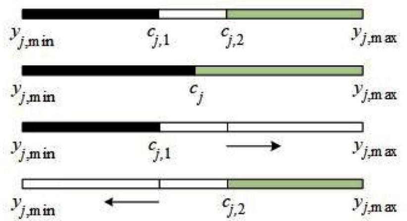 В этих вариантах запрещённые значения показателя представлены только одним отрезком шкалы, а разрешённые значения расширяют норму до границы шкалы. Если же в предикате Pr³(yj, cj,1) нижнюю границу нормы приравнять началу шкалы (cj,1 = yj,min), а в предикате Pr≤(yj, cj,2) верхнюю границу нормы приравнять концу шкалы (cj,2 = yj,max) j-го показателя, точка отсчёта соответственно максимизации и минимизации значения показателя совпадёт с границей шкалы, что обозначается как yj → max и yj → min.