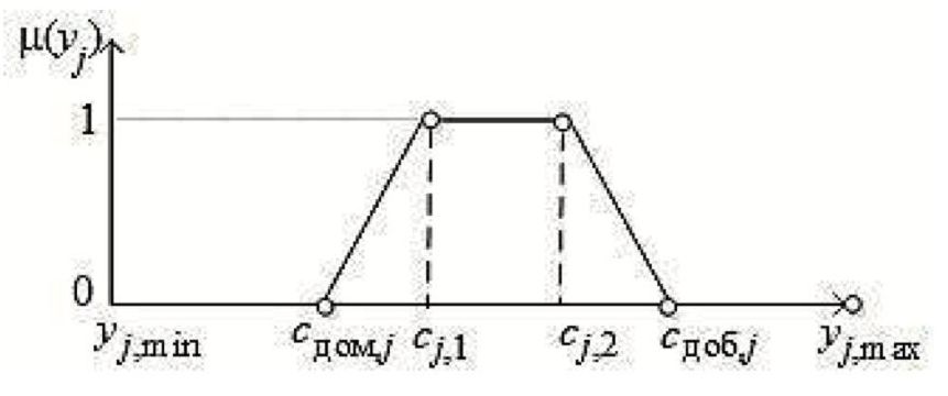 Простейшим отображением нормы является прямоугольная характеристическая функция множества точек [cj,1, cj,2]. Она изображена пунктиром на рисунке 2. Однако в общем случае границы нормы расплывчаты [12]. В отсутствие информации о законе отклонения от нормы до допустимого значения в меньшую сдом,j и большую сдоб,j стороны оно моделируется нисходящими линейными функциями с областями определения [сдом,j, cj,1] и [cj,2, сдоб,j]. Трапеция, изображённая на рисунке 2, представляет собой композицию трёх линейных функций: f1(yj) = a×yj; f2(yj) = 1; f3(yj) = 1 – a×yj с областями определения [сдом,j, cj,1], [cj,1, cj,2] и [cj,2, сдоб,j]. В случае cj,1 = cj,2 = cj область определения функции f2(yj) вырождается в точку cj= (cj,1 + cj,2)/2 (второй вариант шкалы на рисунке 1), а трапеция сводится к треугольнику. Кусочно-линейные функции f1(yj) и f3(yj) с точками перегиба f1(cj)>0 и f3(cj)>0 изображены на рисунках 3а и 3б.