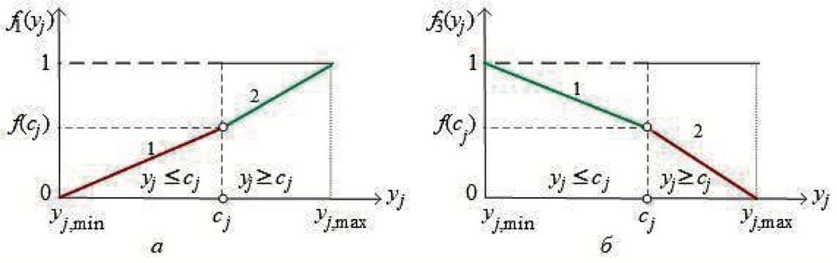 Возрастающая функция f1(yj) удовлетворяет ограничению yj ³ cj,1, начиная с точки cj,1, а убывающая функция f3(yj) удовлетворяет ограничению yj ≤ cj,1 до точки cj. В этой точке они удовлетворяют минимальному требованию к значению показателя [11]. При расширении области определения функций f1(yj) и f3(yj) на всю шкалу (cj,1 = yj,min для f1(yj) и cj,2 = yj,max для f3(yj)) они сводятся к целевым функциям yj → max и yj → min задач оптимизации.