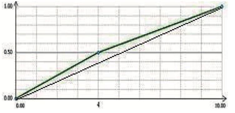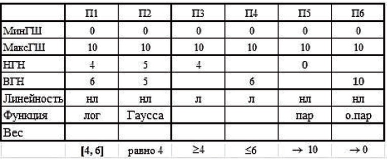 В строках НГН и ВГН показателя П1 заданы границы нормы [с1, с2] = [4, 6]. В качестве ОцФ показателю П1 задана функция принадлежности классу с нелинейными (нл) логистическими фронтами (рисунок 9). Для показателя П2 в строках НГН и ВГН задана средняя точка 5 шкалы [0, 10]. В качестве ОцФ показателю П2 задана функция Гаусса (рисунок 10).
