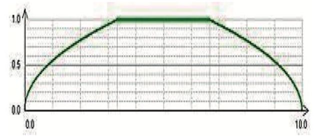 Свойство нелинейности востребовано также применительно к немонотонным ОцФ, каковыми являются функции принадлежности классу. Линейные фронты трапеции (рисунок 2), моделирующие меру отклонения значения показателя от границы нормы (класса), применяются в отсутствие информации об отношении ЛПР к этим отклонениям. Поскольку фронты трапеции являются монотонными функциями, к ним применимы типы функций, изложенные выше, а именно, парабола, обратная парабола и логистическая функция. На рисунках 7-9 изображены функции принадлежности классу с соответствующими фронтами.