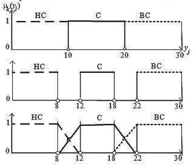 Границы классов могут совпадать, не совпадать и пересекаться. На рисунке 11 показаны варианты соотношения границ на примере трёх классов: «Ниже среднего» (НС), «Средний» (С), «Выше среднего» (ВС). Пересечение границ смежных классов означает частичную принадлежность показателя каждому из них, которая моделируется монотонно восходящим и нисходящим фронтами функции принадлежности (нижний вариант размещения границ).