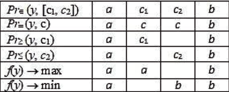 В таблице 1 задан способ кодирования предикатов через соотношение границ шкалы [a, b] и интервальной нормы [c1, c2] согласно рисунку 1. Переменные в строках таблицы 1 расположены в направлении возрастания значений показателя. Первые четыре строки отражают графическое представление предикатов на рисунке 1. В строках 5 и 6 предикаты y ³ c1, c1 = a, и c2 ≤ y, c1 = b играют роль функций: y → max и y → min.