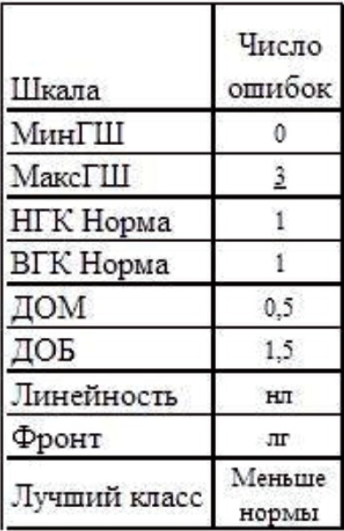На примере показателя «Число ошибок» в таблице 4 приведена информация, востребованная в задаче оценивания отклонения от нормы. Для моделирования расплывчатости границ между классом Н и классами МН и БН таблица 4 дополнена строками – ДОМ (допустимое отклонение от нормы в меньшую сторону) и ДОБ (допустимое отклонение от нормы в большую сторону).
