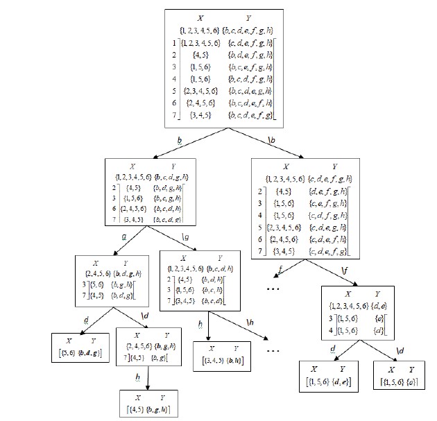 Дополнительное утверждение 8 позволяет организовать поиск замкнутых паттернов без предварительной генерации кандидатов в эти паттерны. Для обнаружения искомых паттернов строится бинарное дерево поиска. Стоит заметить, что путь к каждой вершине можно представить как последовательность дуг двух типов: дуг с метками mk, соответствующими выбору некоторого признака mk и дуг с метками \mk, запрещающими вхождение некоторого признака mk в паттерн. Таким образом, каждый путь в дереве поиска можно охарактеризовать множеством , т.е. множеством признаков, которые не могут входить в паттерн, и множеством , которые обязательно должны присутствовать в паттерне.
