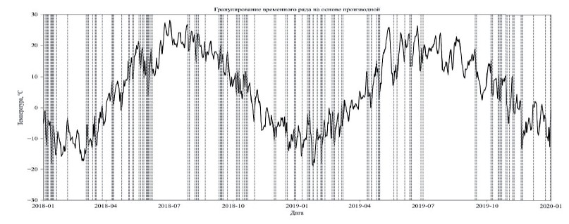 В ходе работы алгоритма до-определяются переменные, отвечающие за вычисление градиента по временным промежуткам – gt. За основной критерий берётся разница данных градиентов ∆gt, которая оценивается относительно заранее установленного ограничения θ. Параметром, отвечающим за накопление количества временных интервалов, соот-ветствующих количеству гранул является переменная q. Для прохода по всем временным интервалам используется переменная t, отражающая начальное количество временных интервалов. Алгоритма отличается простотой реализации и низкими вычислительными затратами на этапе инициализации. Недостатками являются самостоятельное определение порогового значения для производной, что может повлиять на результат гранулирования, а также сложность вычислений. Результат обработки данных этим алгоритмом представлен на рисунке 4.