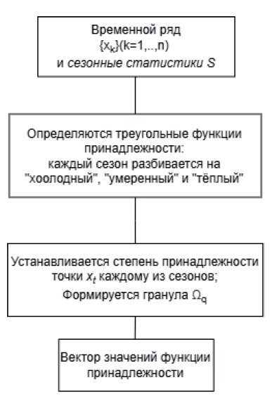 Алгоритмы 1-3 позволяют преобразовать временной ряд ежедневных температур в последовательность гранул, представляющих собой массив среднесуточных температур в течение одной недели (Ωi). Граница Ti определяет индекс исходного временного ряда, с которого начинается гранула i. Затем каждая гранула проходит процесс фаззификации для дальнейшего её использования в формировании правил.