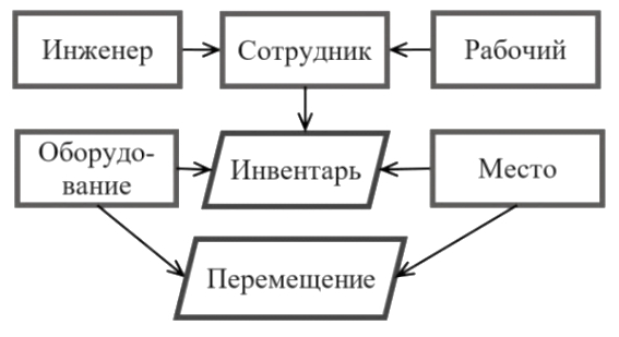 Пример 6. На предприятии за рабочими и инженерами может закрепляться инвентарь. Понятие Сотрудник вводится для обобщения понятий Инженер и Рабочий, которые являются обобщениями понятий конкретных инженеров и рабочих, занимающих соответствующие должности на предприятии.