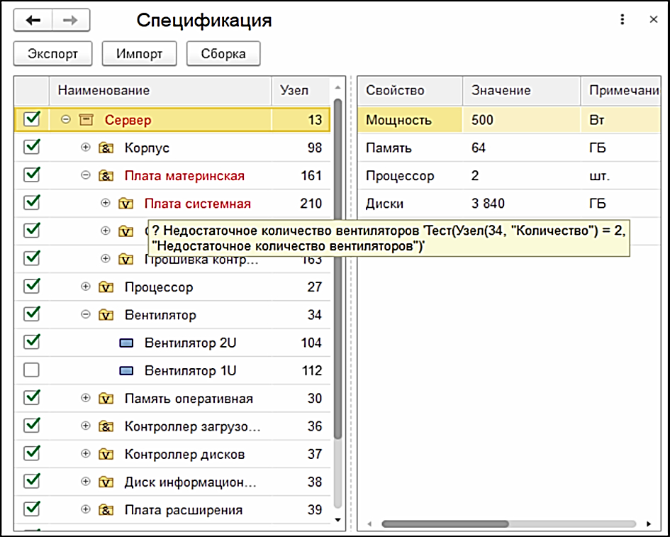 Спецификация изделия осуществляется путём установки или сброса флагов выбора исполнения, входящего в состав некоторого понятия-обобщения. При изменении флага выбора, размещённого в неименованном поле на рисунке 3 в левой часть формы, запускается индуктивная процедура изменения флагов вложенных элементов и обновляются свойства изменённых элементов. Если при спецификации нарушаются ограничения, задаваемые логическими высказываниями, то ошибочные элементы выделяются и выводятся сообщения об ошибке, а также логическая формула, которая не выполнилась (см. всплывающую надпись на рисунке 3).