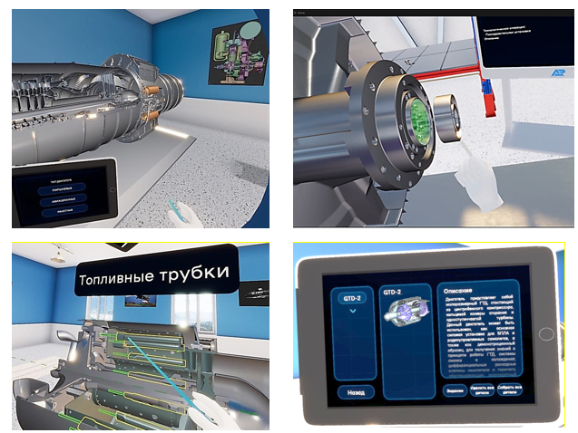 Для организации учебного процесса в ВР-среде разработан виртуальный тренажёр - учебная лаборатория по изучению конструкции двигателей («Виртуальный павильон»), представляющий собой ВР-подобие учебного ангара Центра истории авиационных двигателей Самарского университета и моторных классов кафедры с интерактивными виртуальными макетами двигателей, снабжённых интегрированными базами данных по их техническому описанию. При разработке «Виртуального павильона» учитывались не только функциональные и графические составляющие интерфейса, а также психолого-педагогические особенности этой среды, руководствуясь рекомендациями, изложенными в [18, 19]. В соответствии с концепцией ВР был переработан и дополнен учебно-методический материал, а именно: пособия для выполнения лабораторных работ и некоторые макеты двигателей, которые традиционно используются преподавателями при изучении конструкции, для возможности взаимодействия с ними через иммерсивную среду «Виртуального павильона». Эта адаптация проводилась для демонстрации с использованием ВР шлемов.