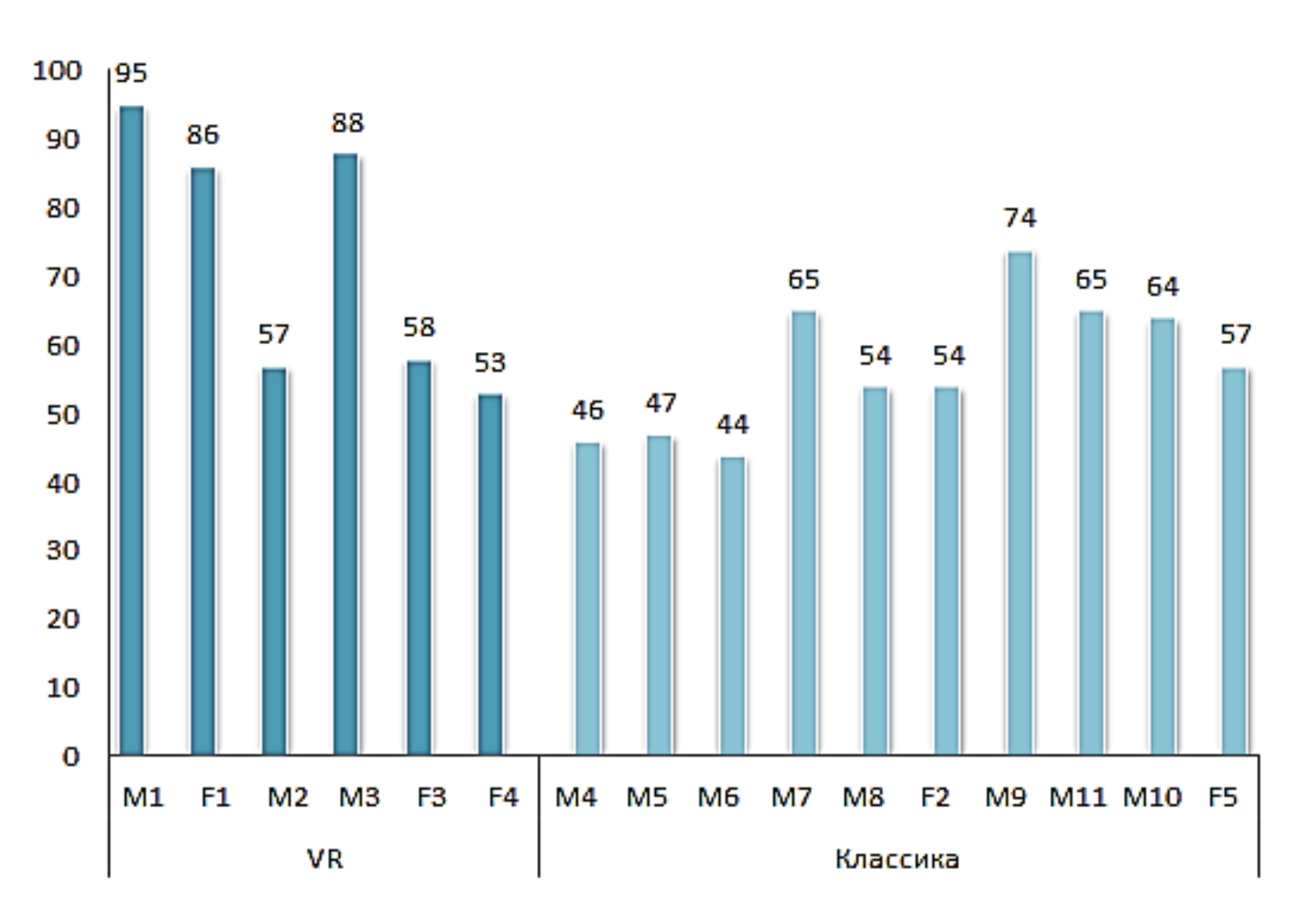 В работе приводятся результаты начального этапа исследовательских работ. Для окончательных выводов пока недостаточно располагаемого объёма достоверных данных. Этим обстоятельством может объясняться существенное различие между представленными результатами и полученными в работах [15-16]. В статье сделана попытка сравнить два подхода с точки зрения подачи разнотипной учебной информации, выявляя их сильные и слабые стороны, с целью составления в будущем обоснованных рекомендаций для методистов-интеграторов электронных образовательных сред по соотношению классических и ВР-подходов в перспективной системе подготовки обучающихся. Учитывая небольшой исходный объём данных, приведённые результаты носят предварительный характер (рисунок 7). Целесообразно учитывать общую успеваемость обучающегося, что позволяет понять, является ли итоговый балл следствием влияния концепции обучения или же это отражение общего уровня знаний и личностной организации студента5.