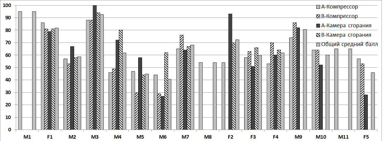 4 Обозначение «M#» соответствует обучающемуся-юноше, «F#» - обучающемуся-девушке. «ВР» означает, что в рамках данной лабораторной работы обучающийся относился к опытной группе. В ином случае, обучающийся относился к контрольной группе и работал над двигателем указанного в таблице типа. Отметка «Без ИЗ» означает, что обучающийся на момент выполнения теста индивидуальное задание (ИЗ) по лабораторной работе не получал и, как правило, причислялся к контрольной группе. Средний балл успеваемости всей группы обучающихся составил 3,8. Обозначения, выделенные жирным шрифтом, относятся к маркам изучаемых ГТД.