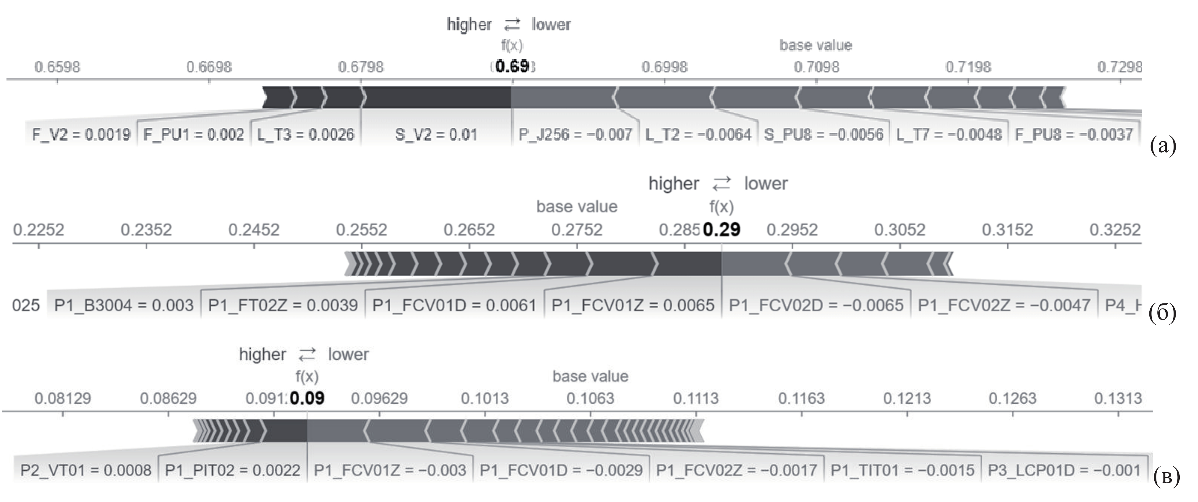 Вектор Шепли для каждого признака можно изобразить в виде графика (см. рисунок 1). Из рисунка видно, как признак с наибольшей ошибкой реконструкции для экземпляра с наибольшей ошибкой влияет на предсказание модели, приближая его к ожидаемому значению. Тёмно-серыми значениями (слева) выделены признаки, которые приближают полученное значение образца к ожидаемому (выделен полужирным), а серыми справа – отдаляющие признаки. Снизу (на графиках - а, б, в) приведены наименования признаков и их значения для выбранного экземпляра. Положительный вклад имеют признаки, которые увеличивают предсказание целевого признака (S_V2 для BATADAL, P2_SIT01 для HAI 1.0 и P2_VT01 для HAI 2.0) и приближают предсказание к ожидаемому значению. Отрицательный вклад имеют признаки, которые уменьшают предсказание модели.