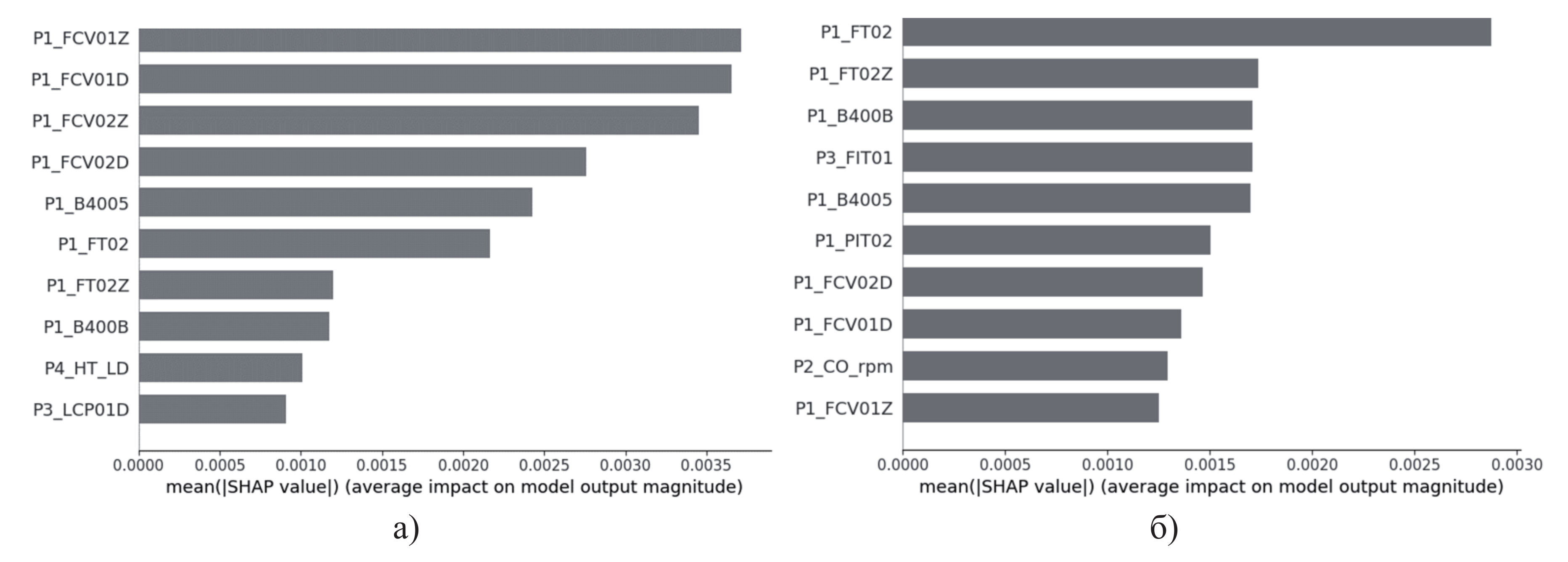 Использование векторов Шепли позволяет продемонстрировать влияние признаков на полученный результат реконструкции. Например, на рисунке 1б можно видеть, что в равной степени (значение Шепли ± 0.0065) на текущую частоту вращения турбины стенда HAI влияют текущее положение клапанов FCV01 (P1_FCV01Z) и FCV02 (P1_FCV02D). Значения данных признаков имеют наибольший вклад в ошибку реконструкции экземпляра данных в целом (см. рисунок 2).
