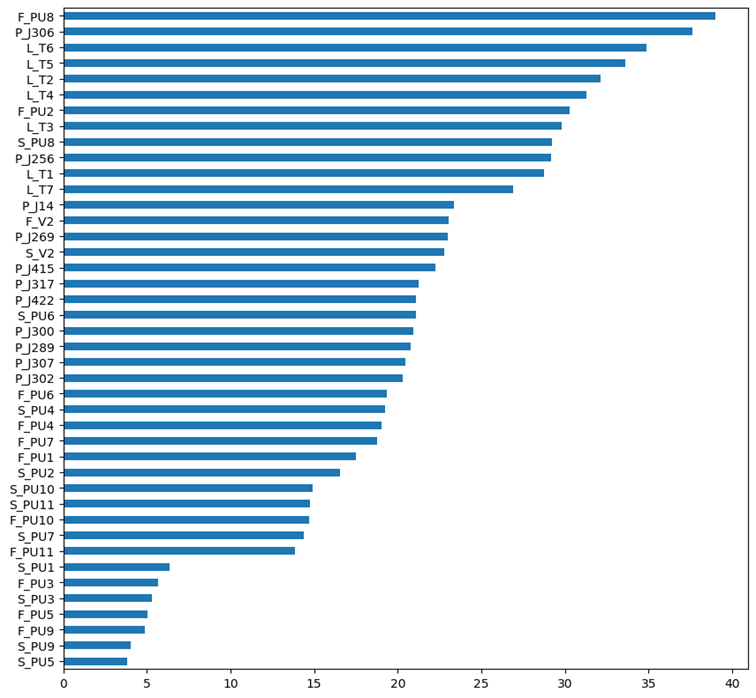 Определён вектор средних значений Шепли для каждого образца данных. На рисунке 2 представлен график десяти признаков с наибольшим вкладом для экземпляра с высшей ошибкой реконструкции, т.е. первые 10 значений вектора средних значений Шепли Vi, i = 234 для HAI 1.0 и i = 653 для HAI 2.0. Вычислены значения среднего рейтинга каждого признака по всем аномальным экземплярам. На рисунке 3 представлен вклад признаков в обнаружение аномалий на наборе данных BATADAL, на рисунке 4 – на наборе данных HAI 1.0, на рисунке 5 – на наборе данных HAI 2.0.