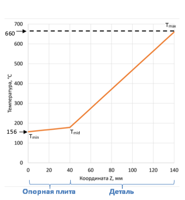 Максимальная температура, поддерживаемая на верхнем конце детали, соответствует температуре плавления типового алюминиевого сплава и составляет 660 °C.