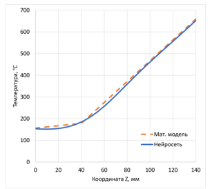 Рисунок 4 – Распределение температур по математической модели и нейросети