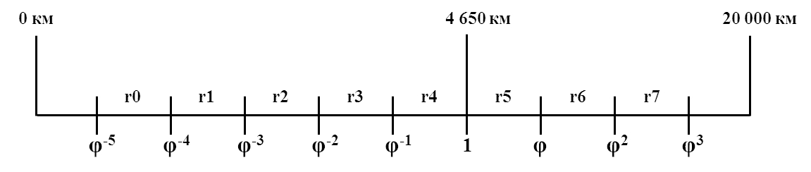 Отсюда для додекаэдра = 4546,76 км, а его проекция на сферу – 4648 км. Используя принцип самоподобия, можно на этой основе построить последовательный ряд уровней дальности сообщения для различных категорий в иерархии ЦМ (рисунок 3), где: является информационным кодом класса дальности сообщений, а степени числа ограничивают – диапазоны дальности перевозок (таблица 1).