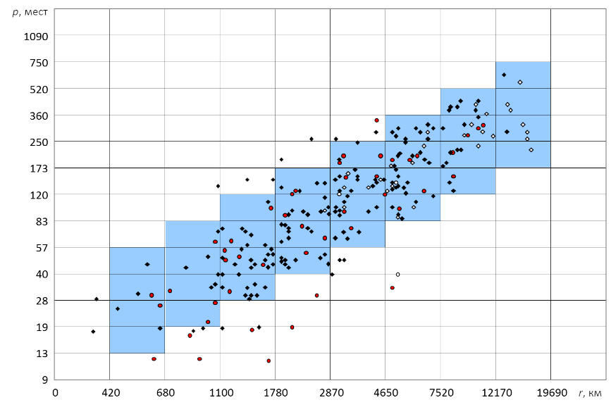 На рисунке 4 в логарифмическом масштабе представлены статистические данные в координатах «число пассажиров – дальность перевозок», которые моделируются четырьмя рядами «малой – умеренной – средней – большой» пассажировместимости в таблице 2. Видно, что возрастающие требования к дальности полёта приводят к логарифмически пропорциональному увеличению расчётной пассажировместимости.