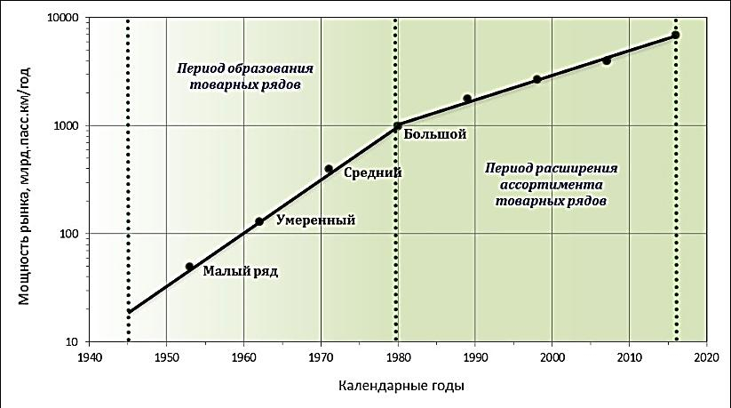 Для того, чтобы несколькими классами ВС был проявлен малый ряд, потребовалось увеличение годового пассажирооборота в мире до 50 млрд. пасс.км. Дальнейшее наполнение этого товарного ряда происходило в процессе последующего развития мирового рынка. В таблице 3 показаны уровни годового объёма рынка пассажирских перевозок, побуждающие авиастроение к созданию товарного ряда ВС соответствующей категории.