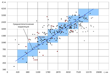 Статистический анализ в прогнозах развития гражданской авиации обычно ограничивается планом . Однако эту функцию нельзя считать исчерпывающей, т.к. она не позволяет в явном виде представить связи с потребной длиной ВПП. Анализ фактических данных (рисунок 8) позволяет заключить, что между множеством данных по длине ВПП и дальностью перевозок существует корреляционная зависимость . Она показывает, что с увеличением требований к дальности сообщений в 10 раз действует общая тенденция к увеличению потребной длины ВПП примерно в 2 раза. В то же время относительно медианного значения этой логарифмически линейной функции существует значительное рассеяние. При одном значении дальности перевозки потребная длина ВПП может отличаться в 2 раза.