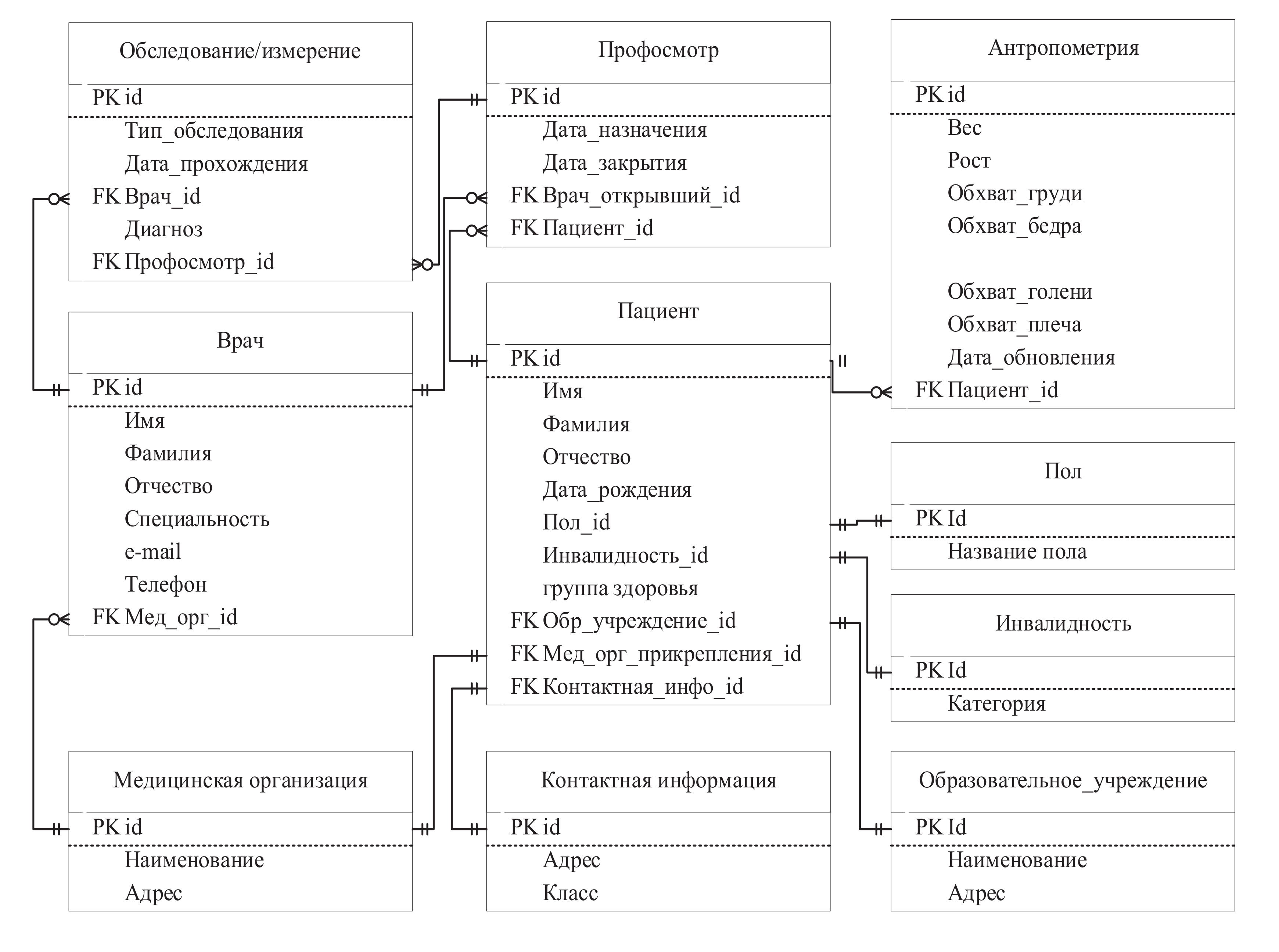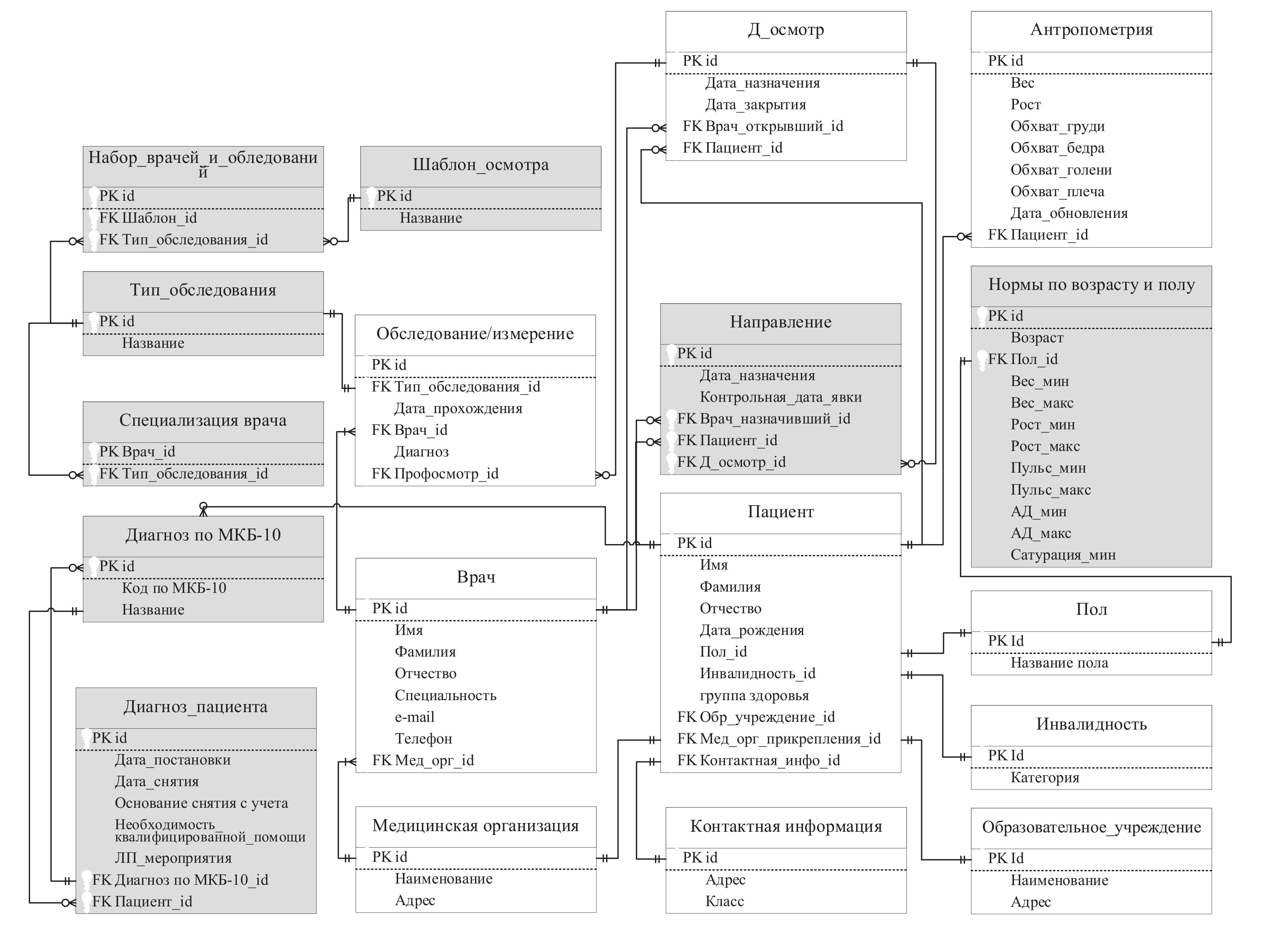 При диспансерных осмотрах детей отслеживается изменение антропометрических данных и показателей здоровья, введена таблица с нормами по половозрастному признаку, что позволяет врачам видеть отклонения от нормы. На завершающем этапе автоматически формируется карта диспансерного осмотра. Схема поддерживает сложные связи между пациентами и их медицинскими данными, что позволяет отслеживать динамику здоровья и способствует улучшению качества медицинского обслуживания.