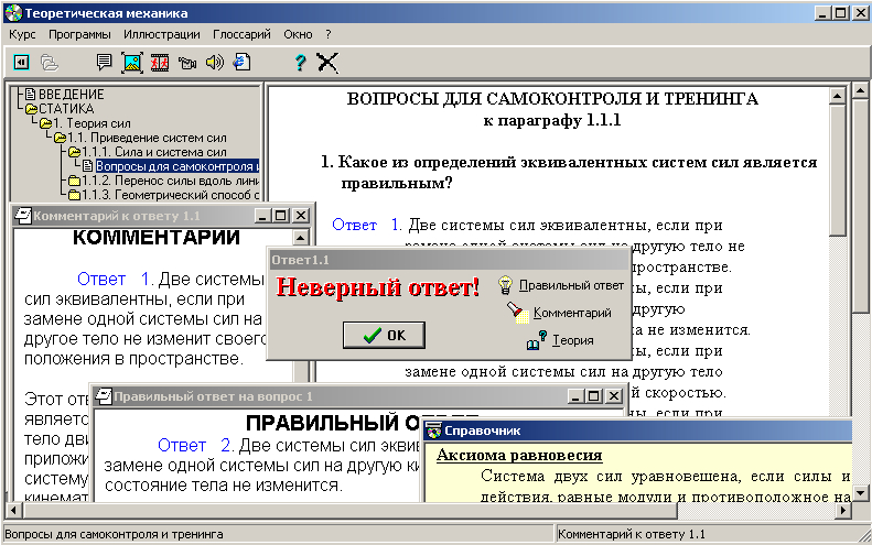 Рисунок 3 – Пример экранной формы тренировки по теории в электронном учебнике по механике [6]