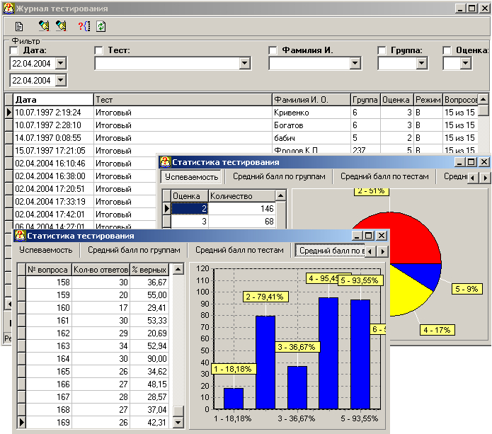 Информация о результатах тренировки и контроля по теории записывается в журнал успеваемости. Программы управления журналом обеспечивают сортировку «цифровых следов» обучающихся по различным признакам, проведение статистического анализа для выявления «трудного» и «лёгкого» учебного материала (рисунок 6).