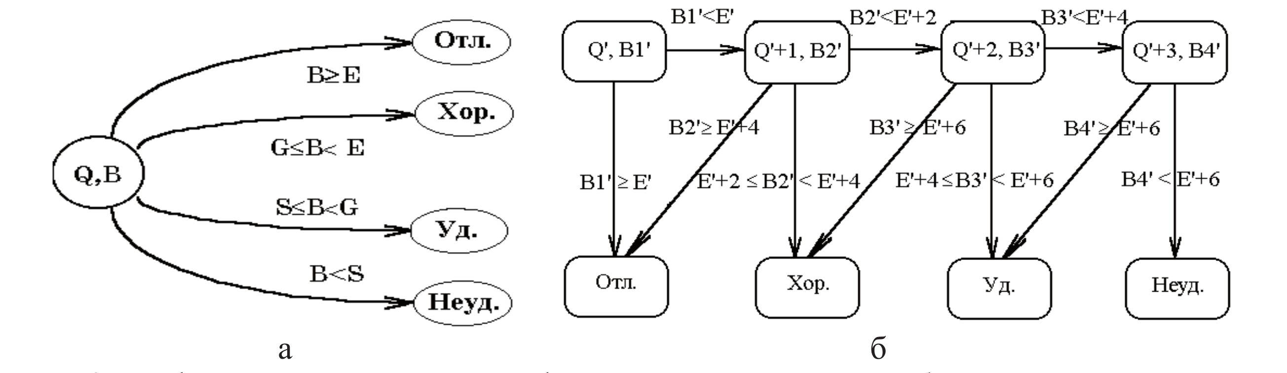 Алгоритм адаптивного контроля с ПЧТ, используемый авторами для экспресс-контроля готовности обучающихся к лабораторным работам, показан на рисунке 9б. В этом алгоритме предельное число баллов за тест, принятое в шкале контроля, Bmax=5, веса всех тестов Vi одинаковы и равны единице, KE = 0.9, т.е Е'=4,5Q'.