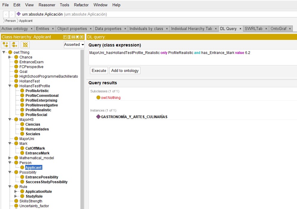 Пример реализации запроса в режиме DL Query представлен на рисунке 2, где показан пример ответа на запрос «Какое направление обучения больше всего подходит абитуриенту с реалистичным профилем по Холланду и результатом вступительных экзаменов 6.2 (по 10-балльной шкале)?». Ответ СППР: «Гастрономия и кулинарное искусство».