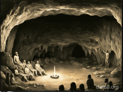 Иллюстрация, созданная Dall-E 3 по описанию: «Нарисуй выход из «пещеры Платона». Изобрази пещеру Платона, которую он описал в труде «Государство». https://dalle3.org/record/beb06a47-baac-4d88-8822-8f8ee5f23b76