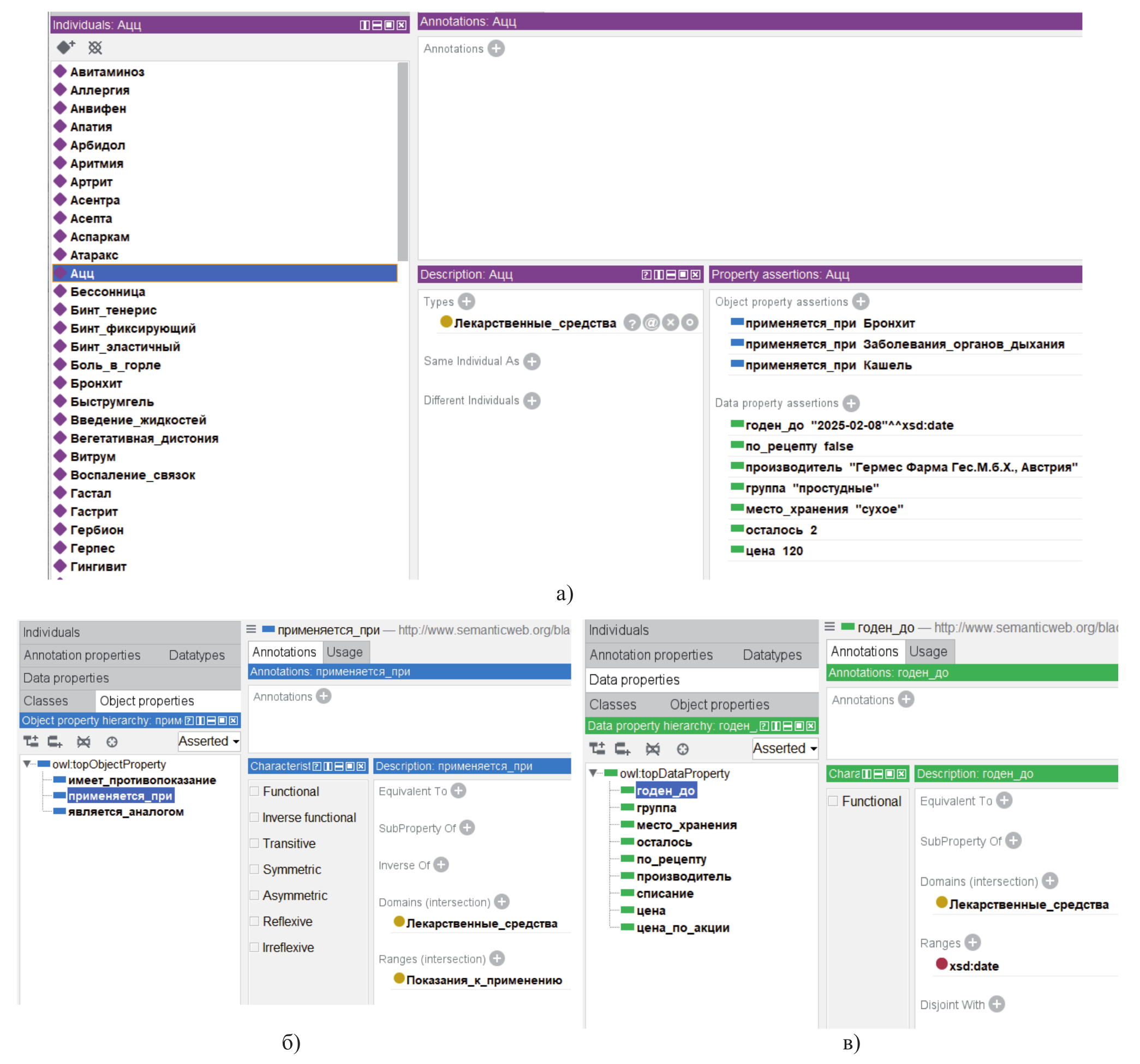 Рисунок 2 – Некоторые экземпляры (а) и свойства (б, в) фармацевтической онтологии