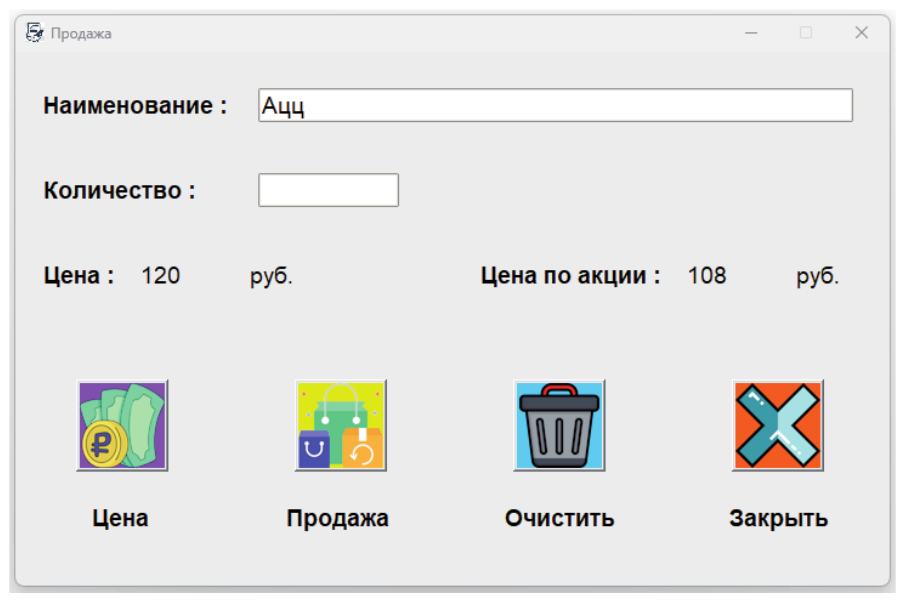 В разделе «Продажа» содержится текстовое поле, которое предназначено для внесения названия ЛС, и поле для занесения необходимого количества для продажи (рисунок 4). В нижней части окна раздела расположены функциональные кнопки. Кнопка «Цена» выводит на экран цену интересующего наименования и цену по акции, если такая имеется на соответствующую фармакологическую группу. Кнопкой «Продажа» выводятся сведения о реализации потребителю выбранного наименования и соответствующего ему количества товара. Активация этой кнопки происходит уменьшение запасов выбранного товара в аптеке. Кнопка «Очистить» служит для очистки всех полей ввода от находящейся в них информации на случай неправильных или ошибочно введённых данных. Кнопкой «Закрыть» закрывается текущая вкладка.