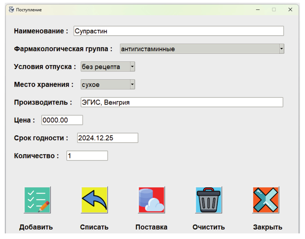 Раздел «Поступление» связан с добавлением в БЗ нового наименования и его характеристик (рисунок 6). На вкладке есть несколько текстовых полей, в которые можно занести название ЛС, его фармакологическую группу, условия отпуска, место хранения, название фирмы-производителя, цену на товар, срок годности и количество. Некоторые позиции представлены раскрывающимися списками (например, из условий хранения можно выбрать сухое, тёмное или прохладное место, а для условий отпуска - без рецепта и по рецепту.