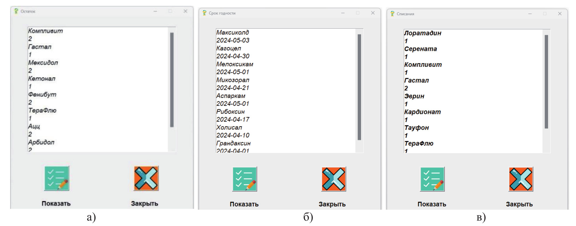 Рисунок 8 – Разделы «Остаток» (а), «Срок годности» (б) и «Списание» (в)