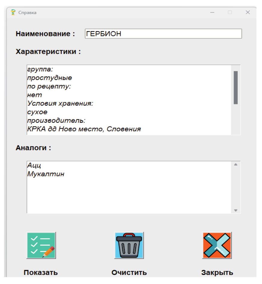 Раздел «Симптомы» позволяет получать доступ к ЛС и их аналогам по введённому симптому или заболеванию (рисунок 7). Внутри вкладки находится поле для ввода текстовой информации и функциональные кнопки поиска, очистки полей и закрытия активного окна. Поиск по симптомам осуществляется с помощью БЗ и МЛВ, что позволяет найти доступные в фармацевтической онтологии болезни и симптомы, которые входят в показания к применению имеющихся в наличии ЛС. Если перед продажей необходимо отобрать препараты с учётом их противопоказаний [20], то используется кнопка «Противопоказание» (например, при кашле можно применять Ацц, Гербион или Мукалтин; если выбрать противопоказание, связанное с язвенной болезнью желудка, то останется один препарат, соответствующий этим критериям отбора – Гербион).