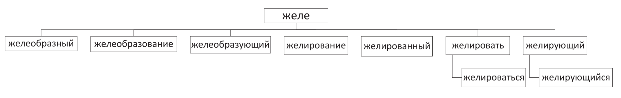 Представляется, что разграничение широкого и узкого подходов к выделению ТГ важно для терминологических словарей, построенных по гнездовому принципу. Орфографический словарь не имеет гнездовой структуры, но даёт представление о том, что зачастую термины входят в язык не по одному, а сразу целой совокупностью родственных слов: папилломавирус, папилломавирусный; гелирование, гелеобразный; нейросеть, нейросетевой; энолог, энология. Наблюдаются и более развёрнутые ТГ, одно из которых представлено на рисунке 2 (составлено на основе [15]).