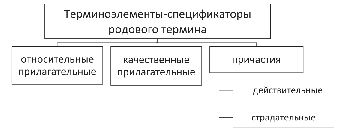 На рисунке 3 схематично показаны основные способы выражения терминоэлементов-спецификаторов, формирующих вторую когницию в термине. Пополнение словника обозначенными морфологическим разрядами слов свидетельствует о том, что неологизация происходит за счёт слов, относящихся к профессиональной языковой картине мира.